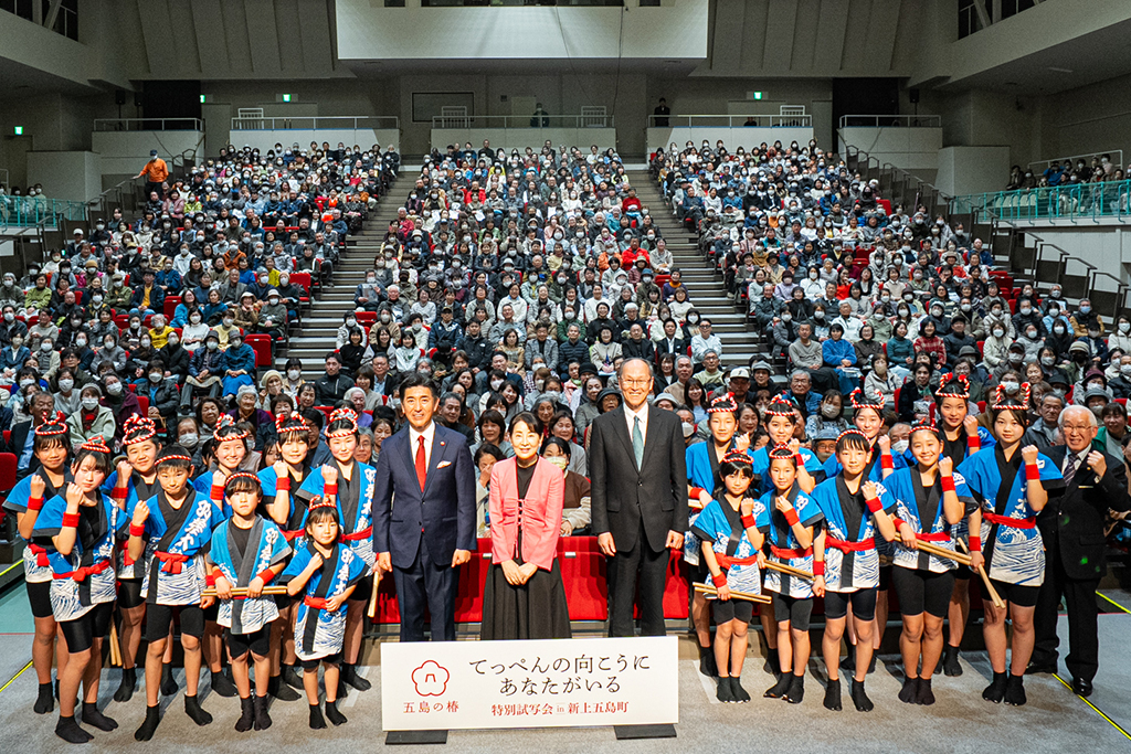 「五島の椿プロジェクト」特別企画第3弾として、3月8日(日)に長崎県新上五島町の石油備蓄記念会館にて、特別上映会を開催しました。これまで、2022年4月に『いのちの停車場』、2023年9月に『こんにちは、母さん』の上映会を五島市で開催いたしました。今回は特別上映会で初めて、五島列島の北部に位置する新上五島町での開催となり、当日は約1500名の応募の中から当選した870名ほどの島民が来場、会場はたくさんの笑顔と熱気に包まれました。舞台挨拶には主演の吉永小百合さんにご登場いただき、映画に対する想いや、本作に関する共演者とのエピソード、以前五島列島で撮影された作品についての思い出話などにも触れ、島民の皆さんが笑顔で興味深く耳を傾けていました。上映会を主催した松下財団代表理事 松下剛さん、共催された新上五島町 石田町長からの五島弁を交えてたユーモア溢れるご挨拶に加え、豪華景品が当たる抽選会や有川羽差太鼓保存会による歓迎演奏が行われ、会場には世代を超えた一体感が生まれました。今回上映された作品は2025年10月31日に公開された映画『てっぺんの向こうにあなたがいる』。本作は、女性として世界で初めてエベレスト登頂を果たした登山家・ 田部井淳子さんの半生を描いた感動作です。自然と向き合い、「自然を守り、次世代へ希望をつなぐ」生き方を貫いた田部井さんの精神は、椿を通じて島の自然と文化を未来へ継承する本プロジェクトの理念と深く響き合います。